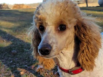 Ruby is AKC registered red poodle. She is 25 lbs and 16" tall. Ruby is heathtest clear through embark and Paw print. She is OFA tested. Ruby loves to talk. She has so much personality and fills our house with joy.